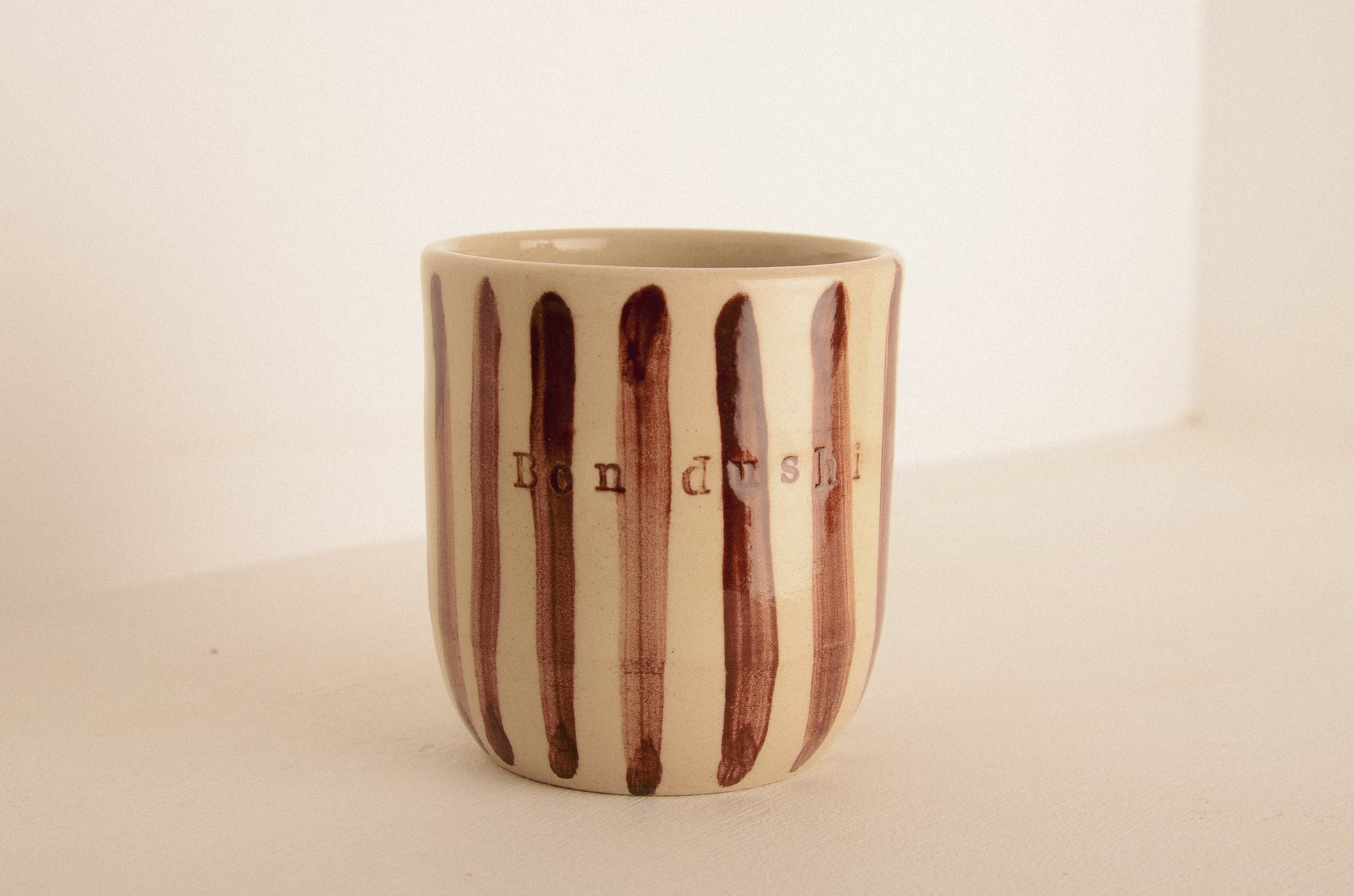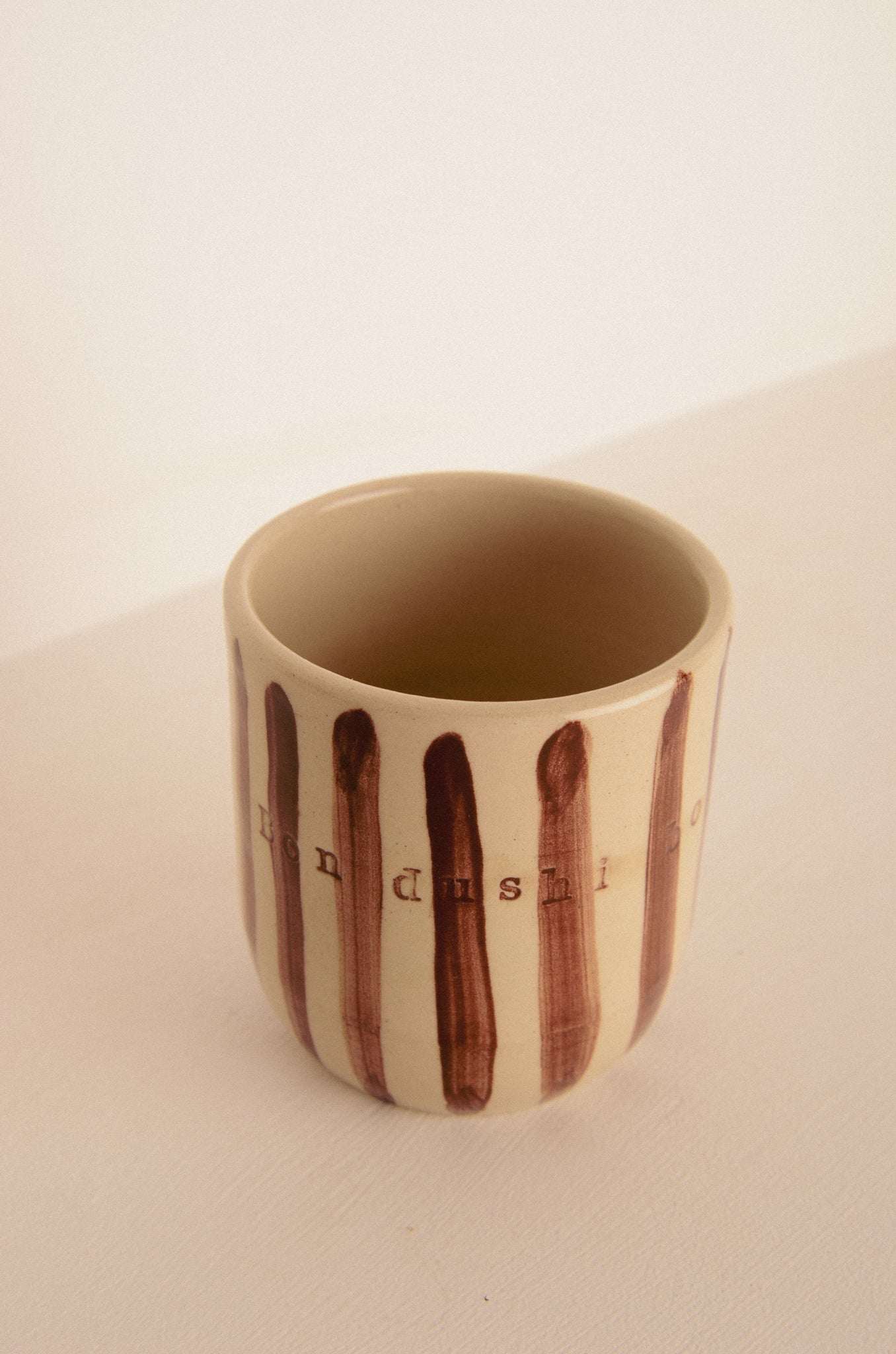 This cup is handmade on the potters wheel. With stamps is written: "Bon dushi bo ta" brown text and brown decorative stripes, glazed with a transparent shiny glaze.