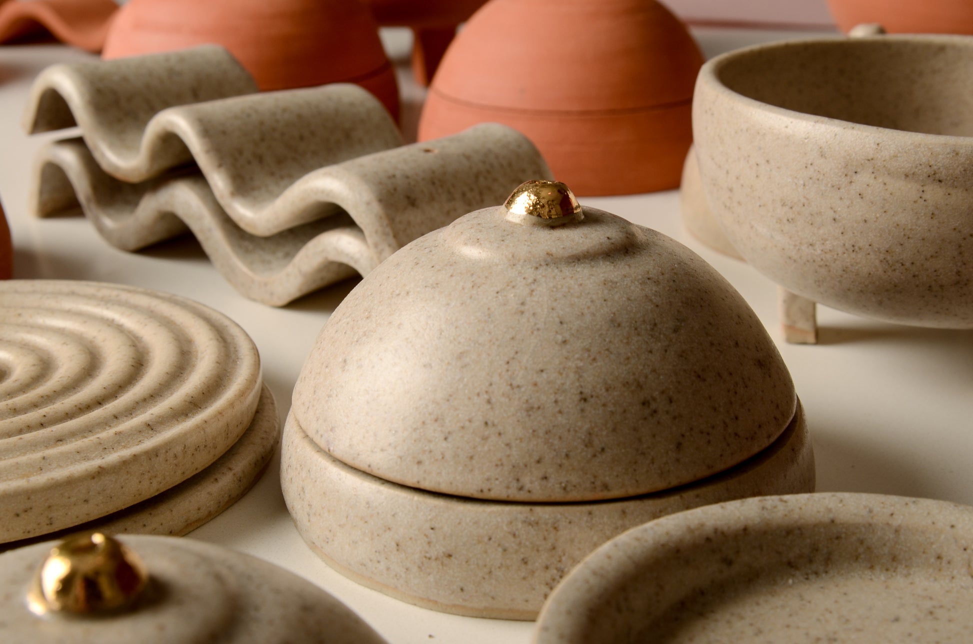 The Boobie dish is shaped and hand thrown on the potter's wheel and glazed with a semi matte speckled beige glaze with a 24KT gold detail.