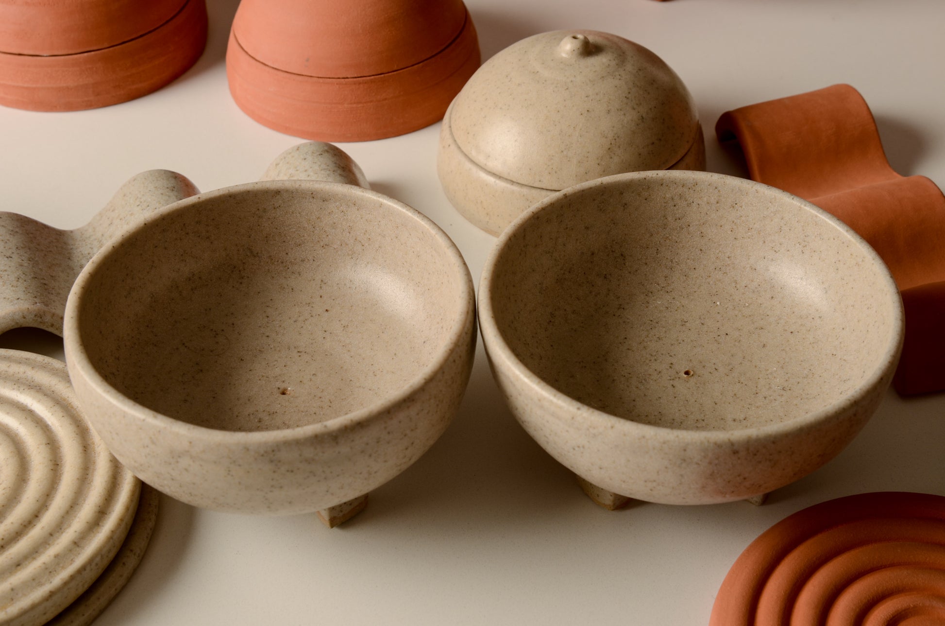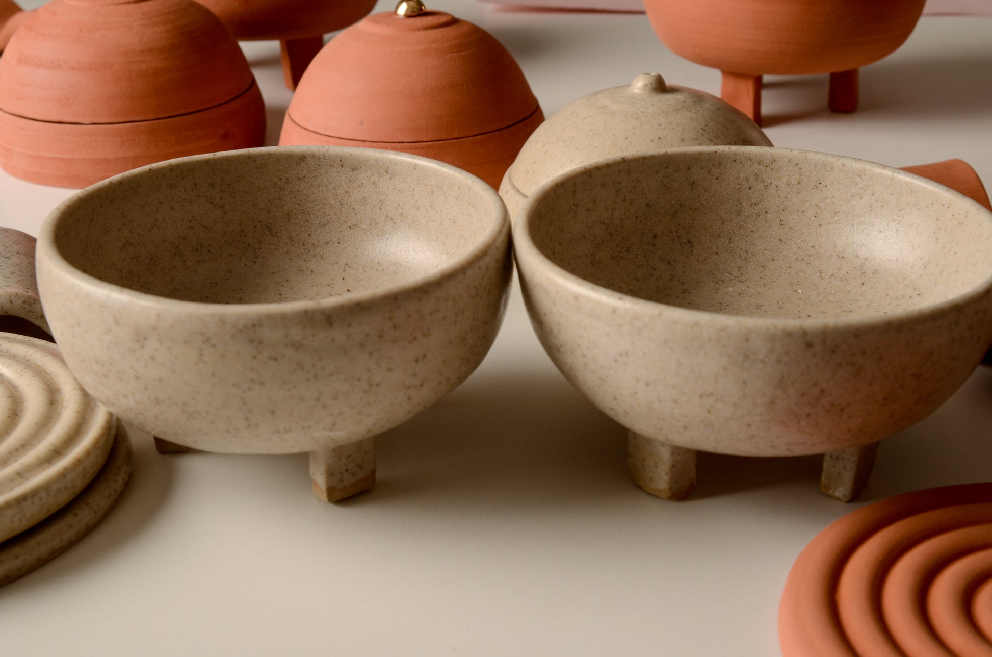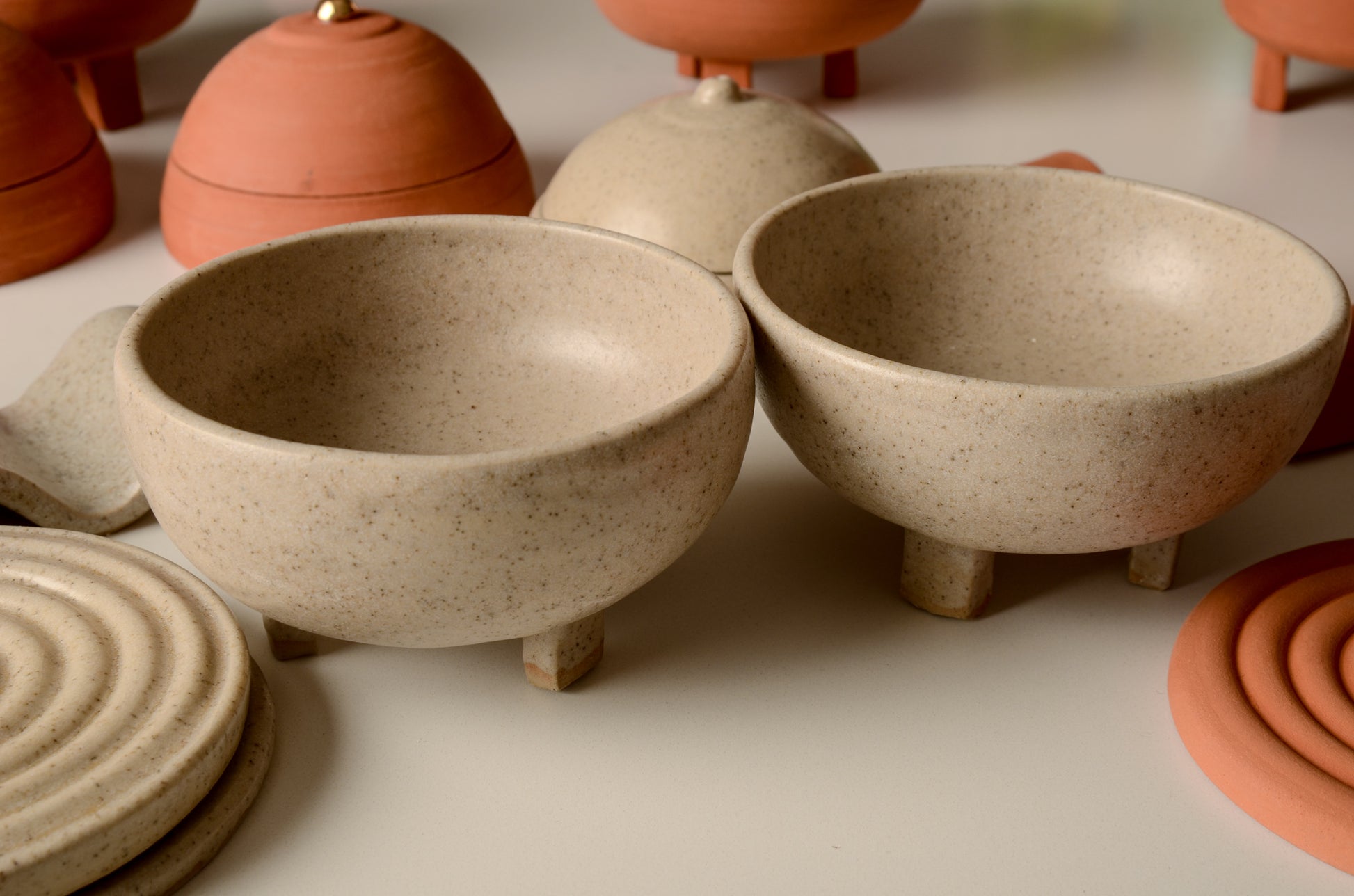 The Raised Bowl is shaped and hand thrown on the Karamics potter's wheel with a semi matte speckled beige glaze.