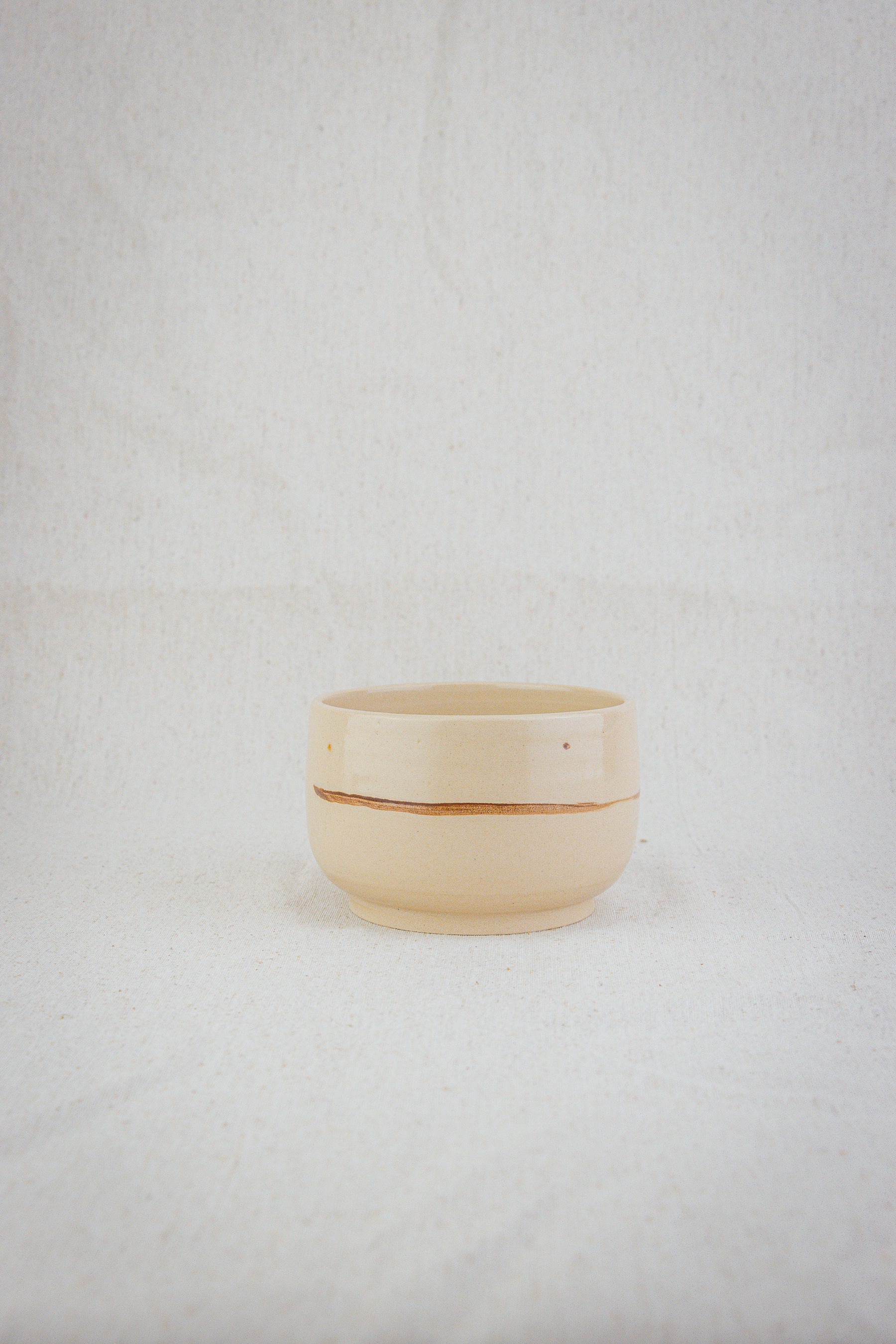 This ceramic bowl is handmade on the potters wheel and glazed with a transparent glaze, showing the natural colour of the glaze. On the outside there's one line painted with brown glaze, inspired by the zen circle.