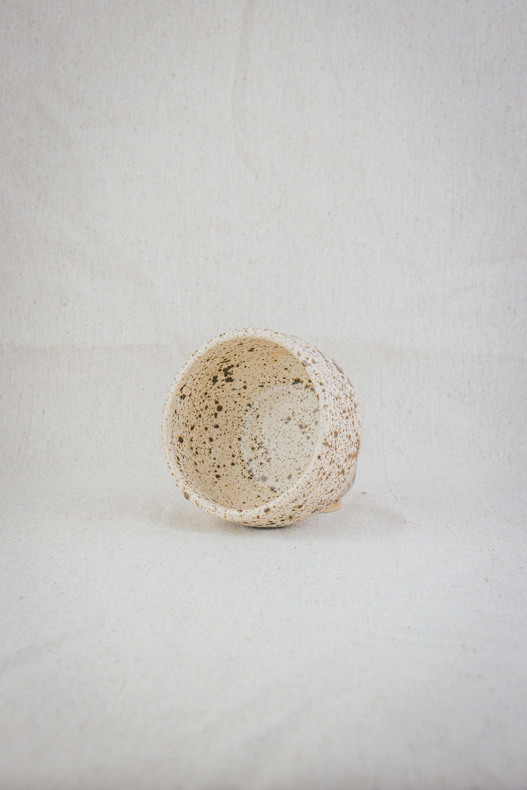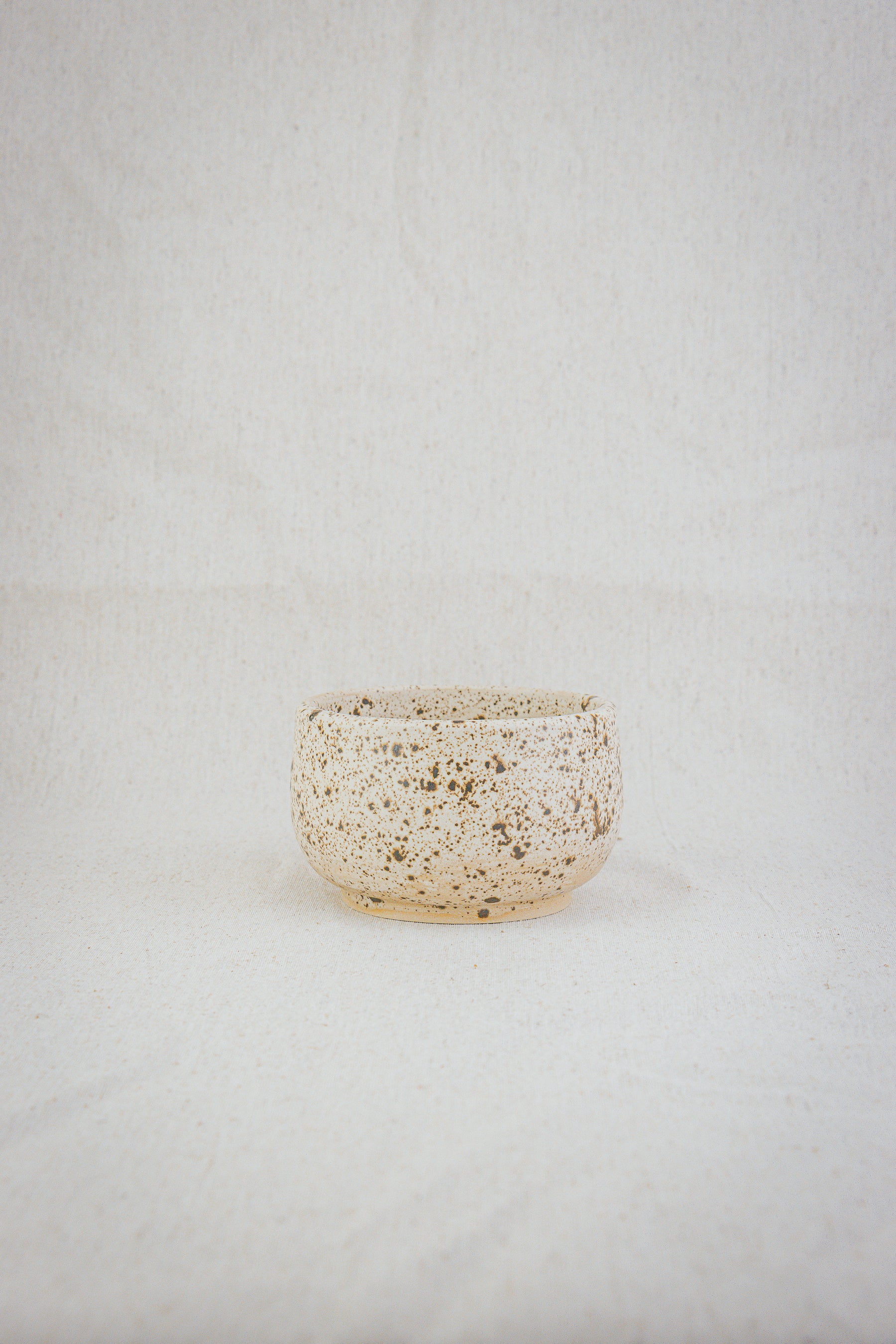 This ceramic bowl is handmade on the potters wheel and glazed with a white glaze with brown spots.
