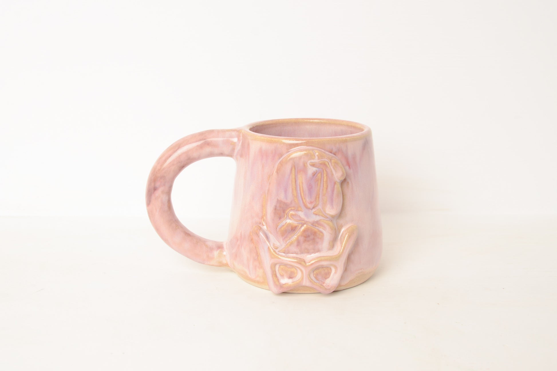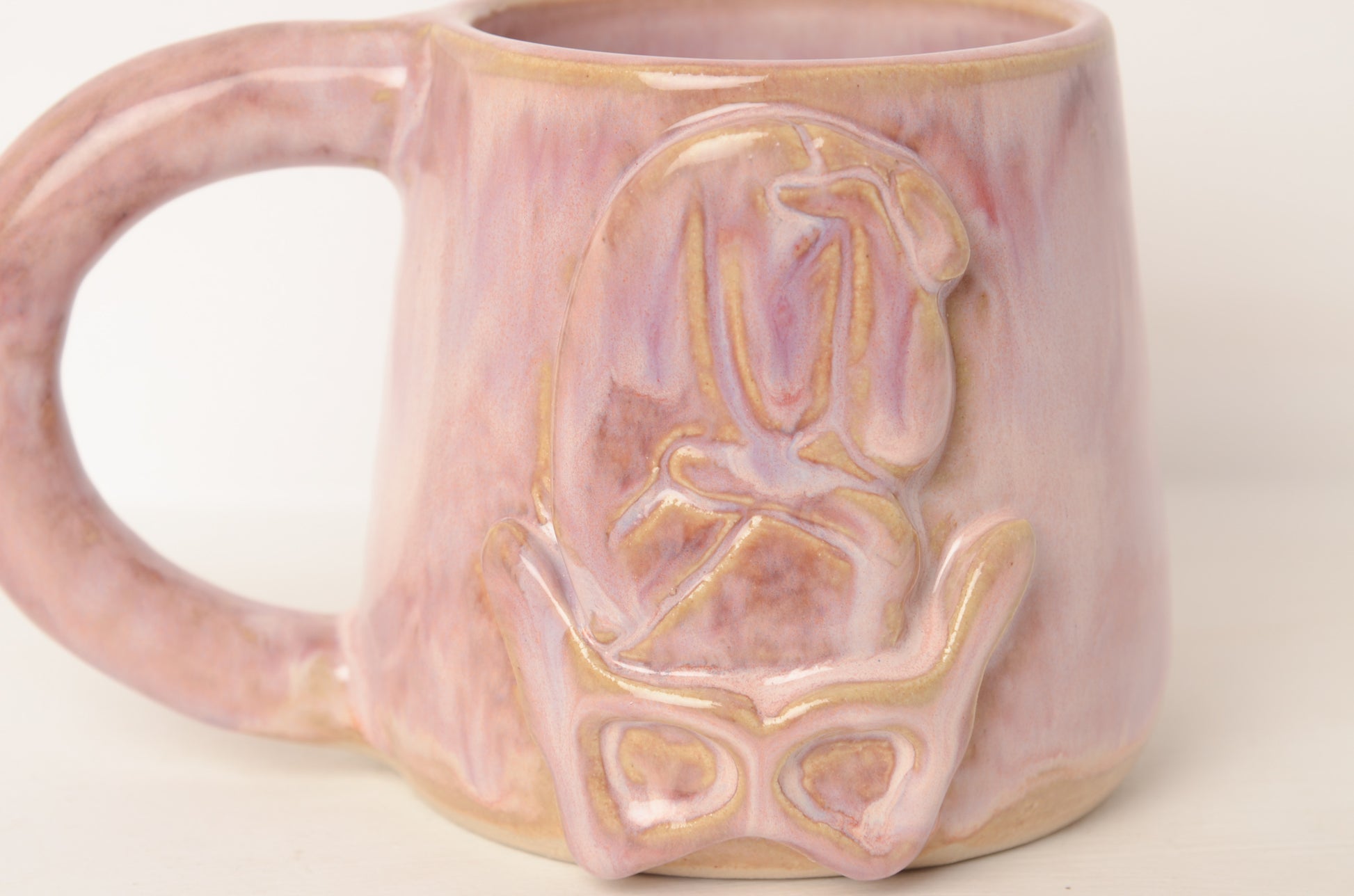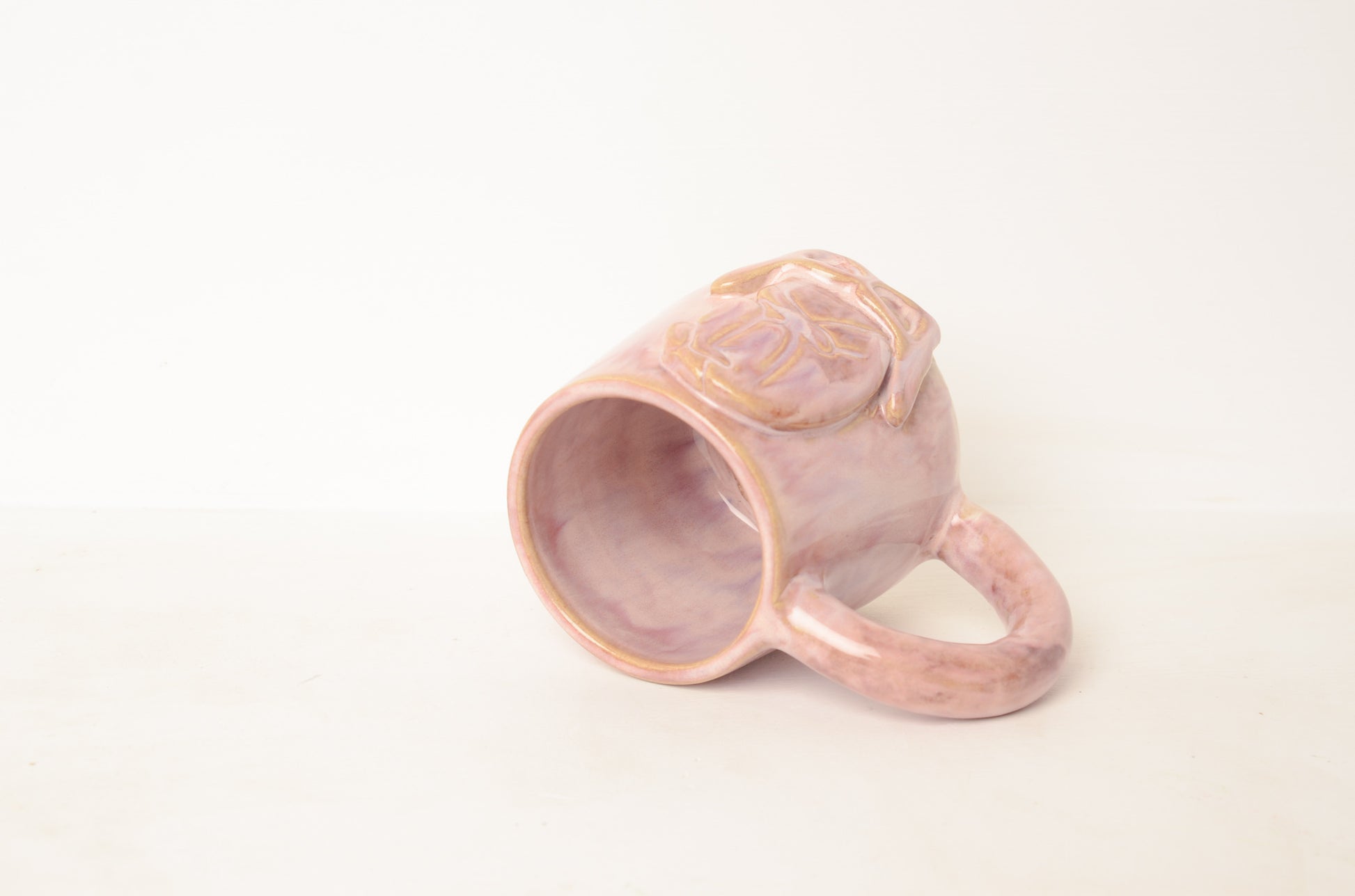 Thrown on the potterswheel this mug is both a mug and metaphor holding not only your favorite drink but also the tension of emergence. Each piece is unique, glazed with pink and purples tones.