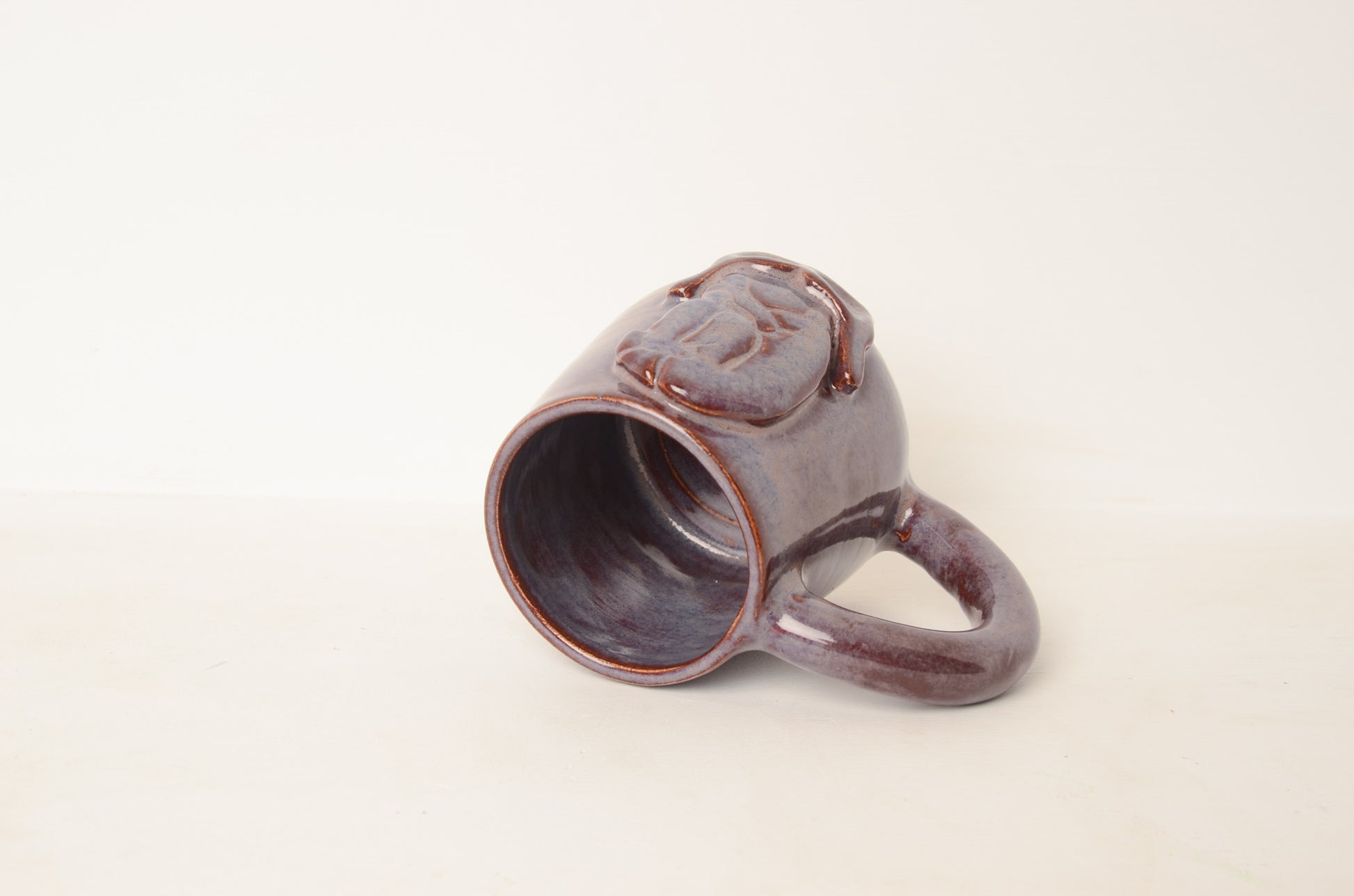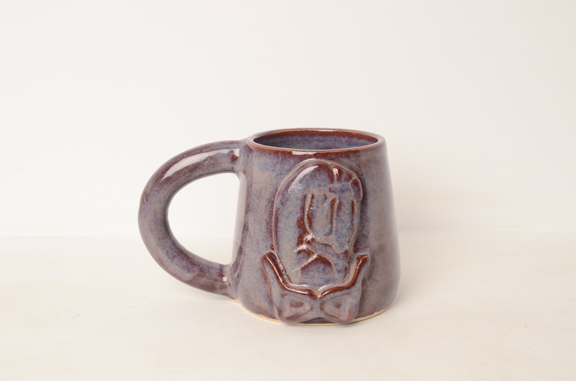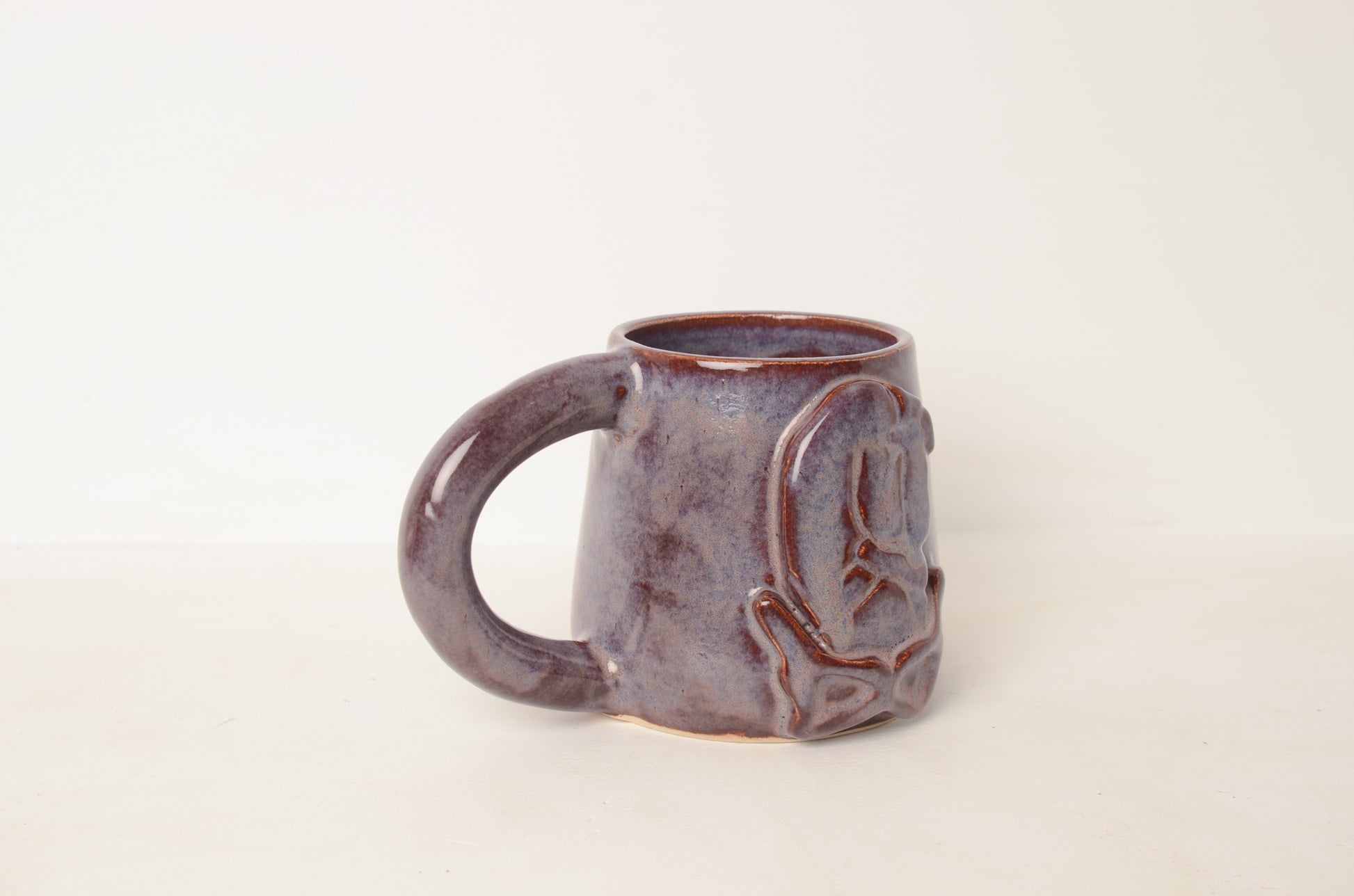 Thrown on the potterswheel this mug is both a mug and metaphor holding not only your favorite drink but also the tension of emergence. Each piece is unique, glazed with purple glaze