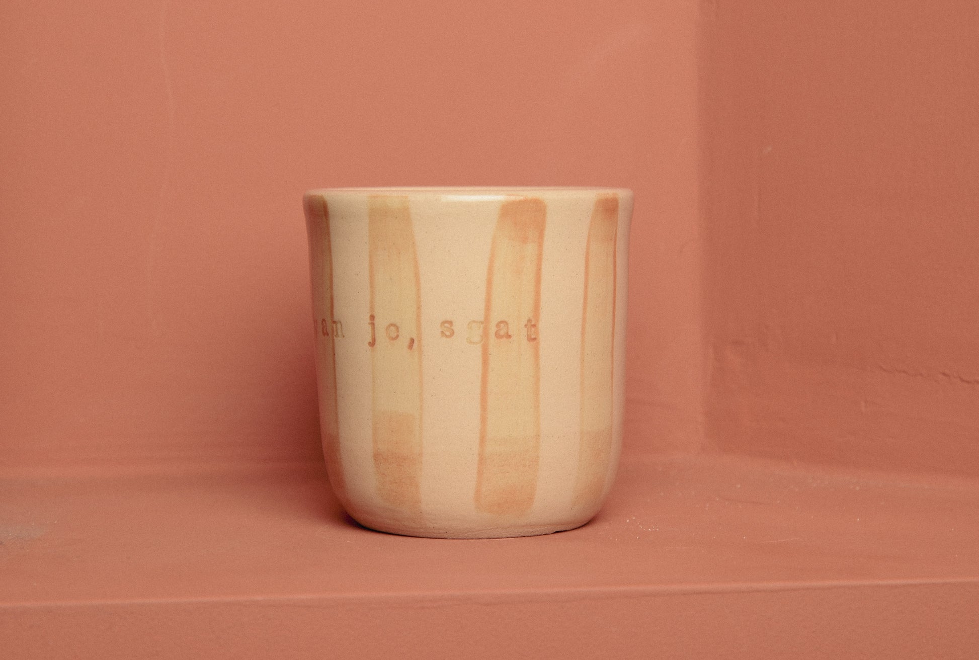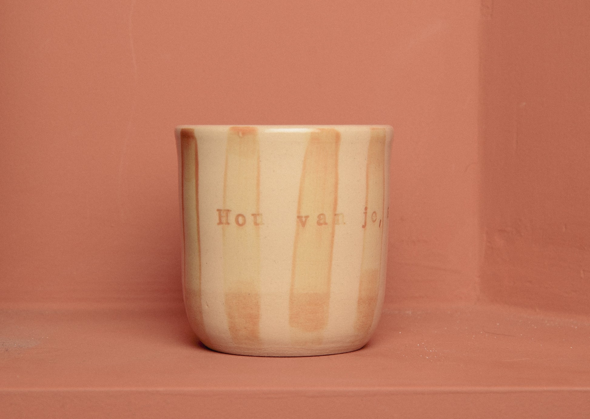 This cup is handmade on the potters wheel. With stamps is written: "Hou van je sgat"