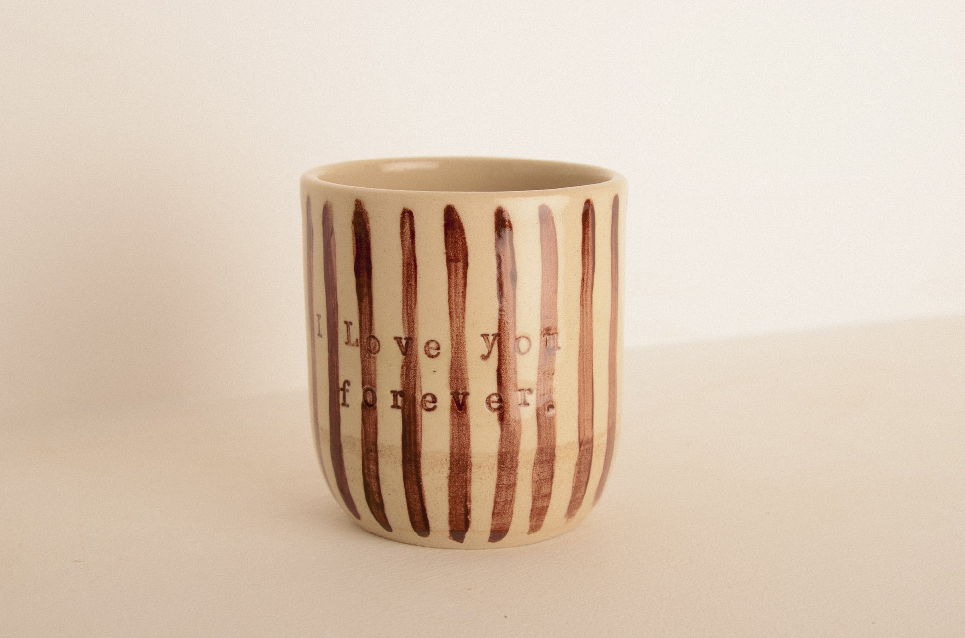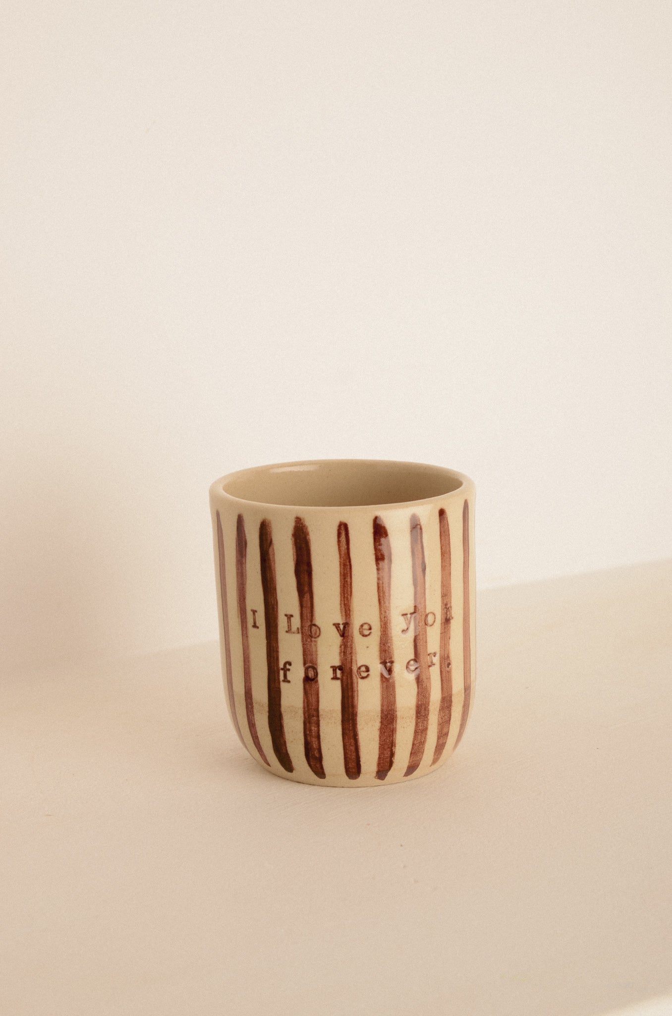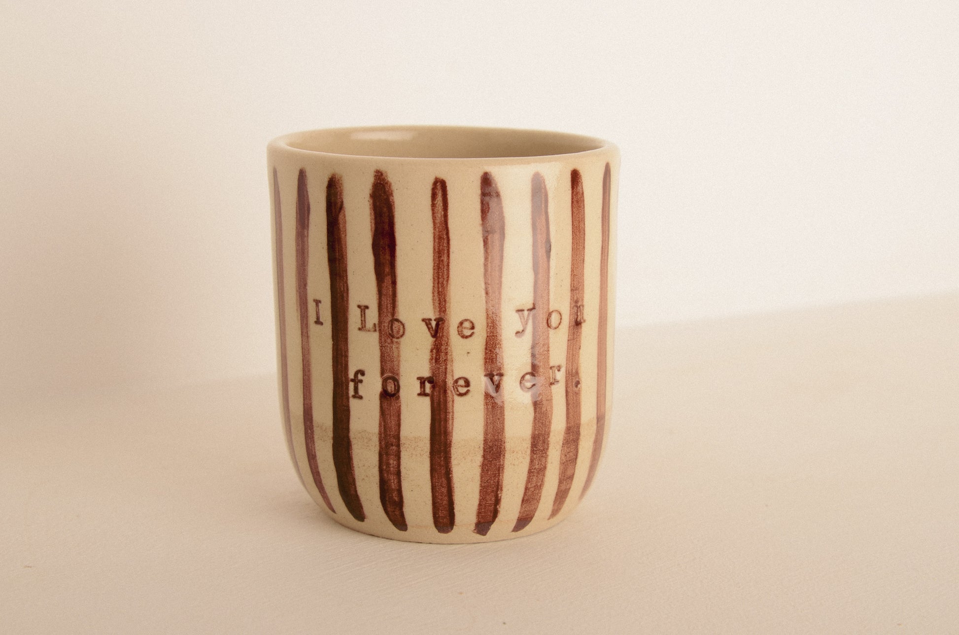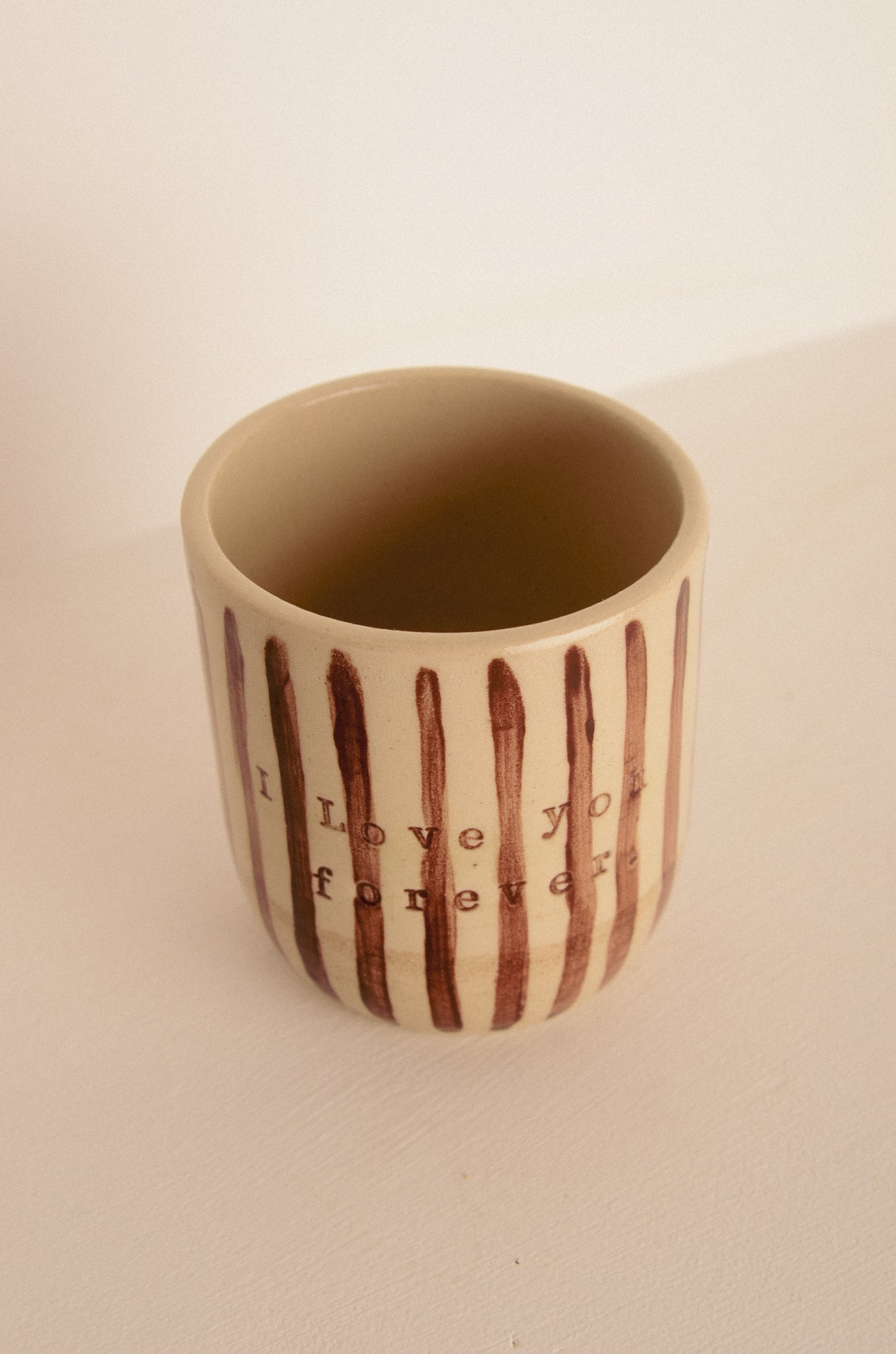 This cup is handmade on the potters wheel. With stamps is written: "I love you forever" Brown text and brown decorative stripes, glazed with a transparent shiny glaze.