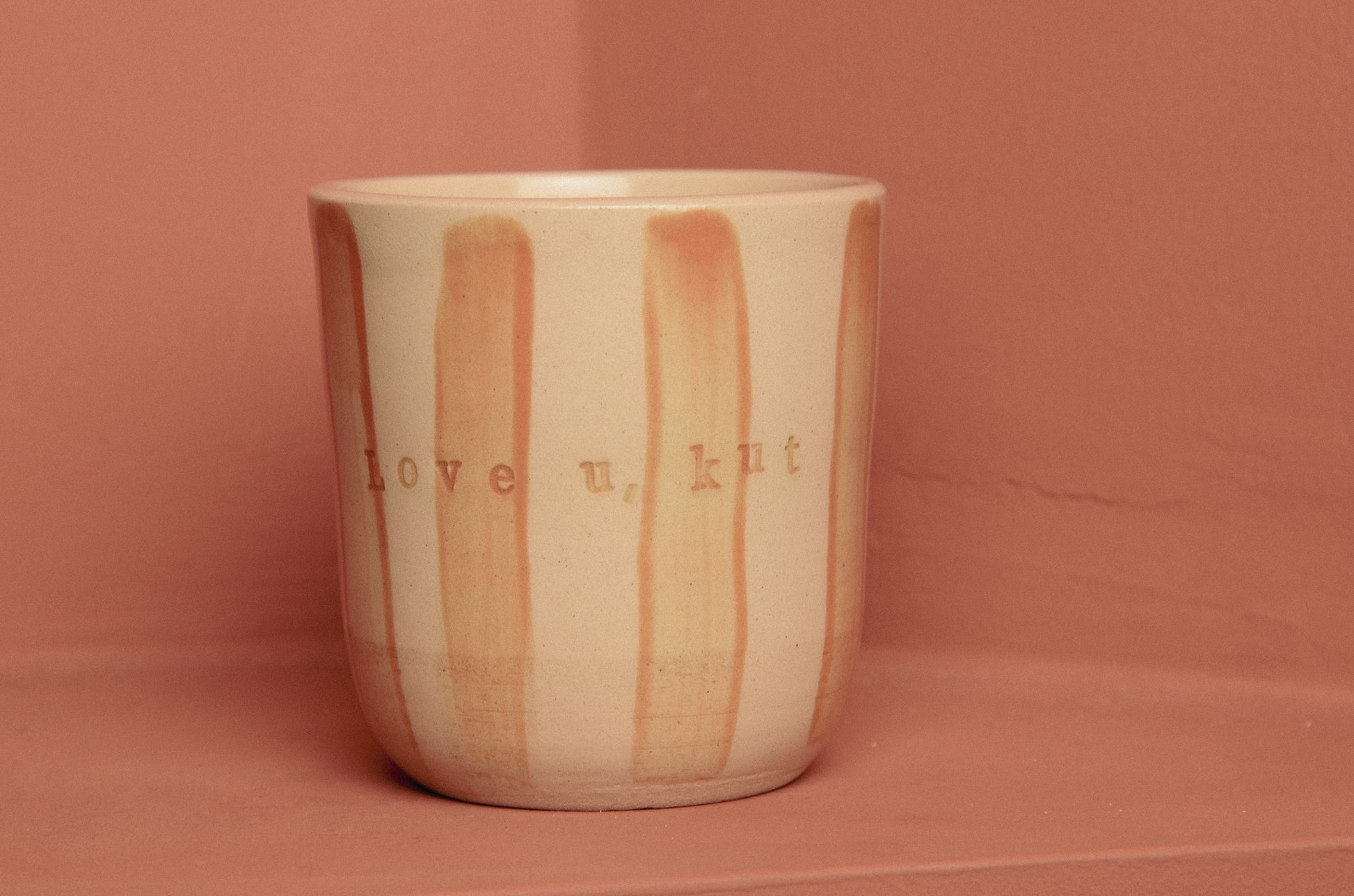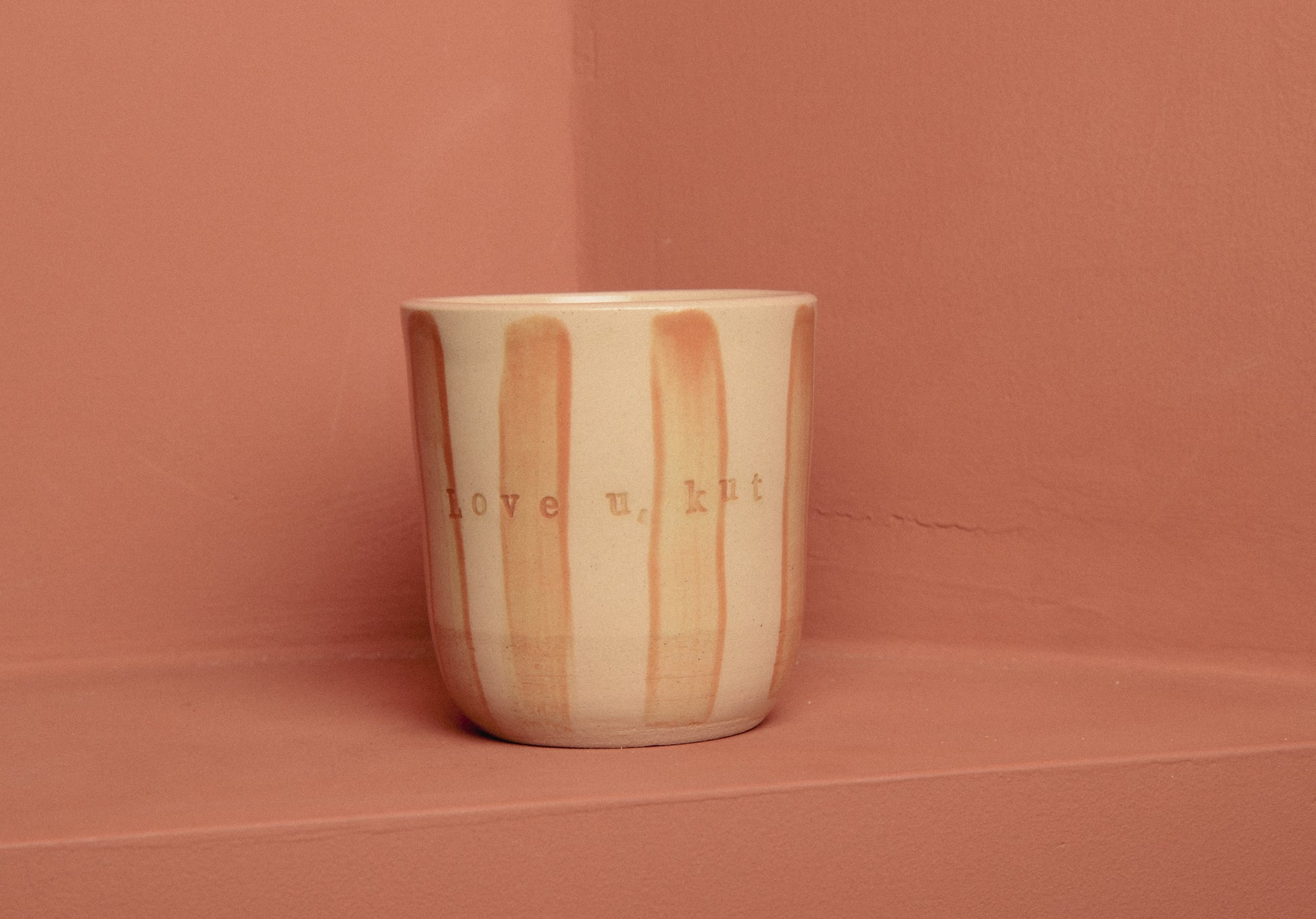 This cup is handmade on the potters wheel. With stamps is written: "Love you, kut"