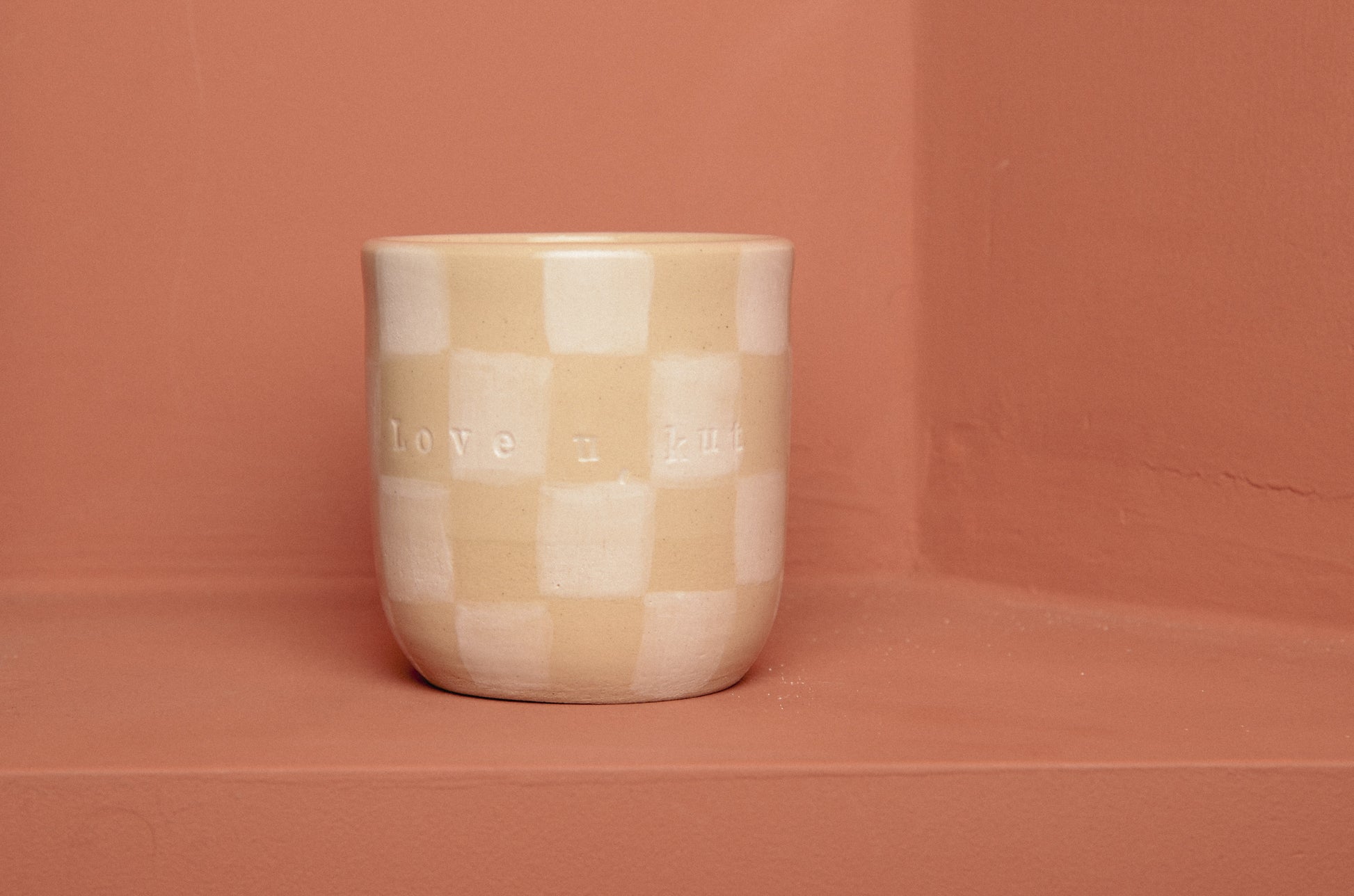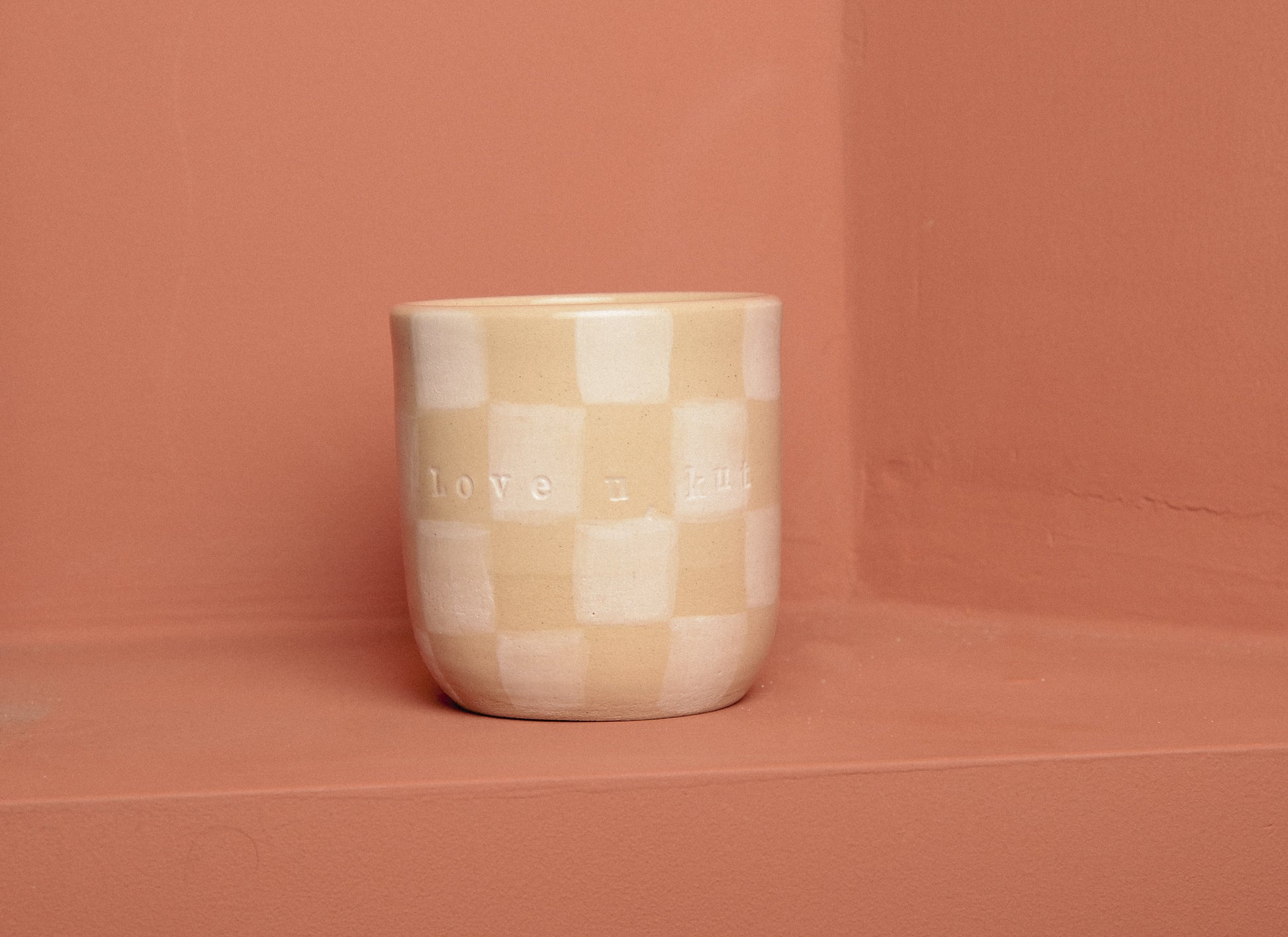 This cup is handmade on the potters wheel. With stamps is written: "Love you kut" White text and white decorative checkerboard, glazed with a transparent shiny glaze.