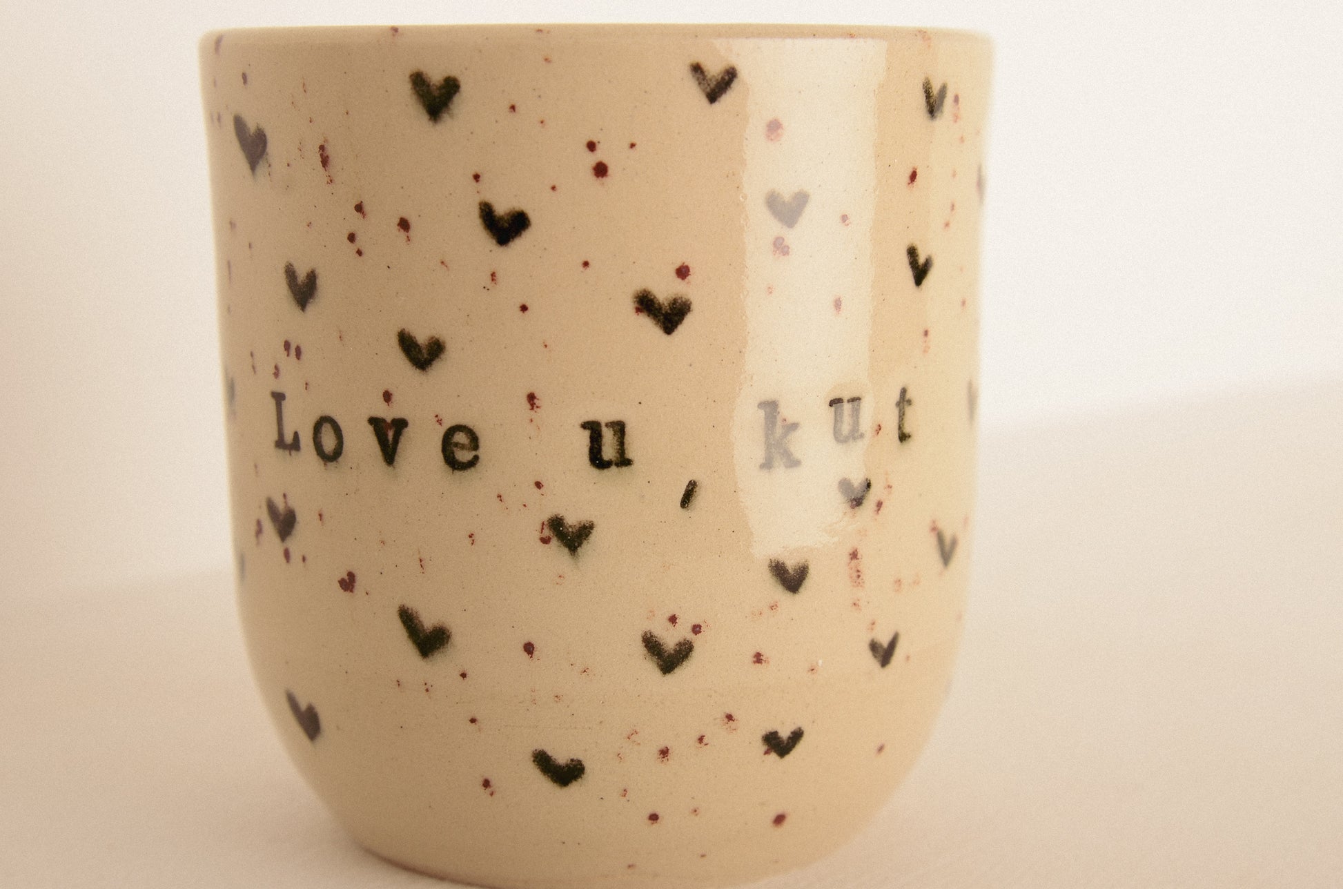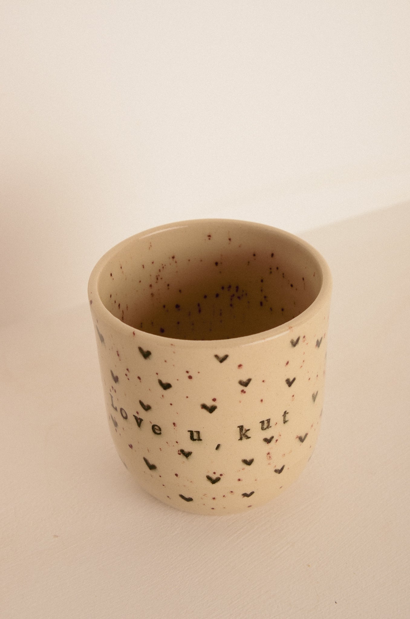 This cup is handmade on the potters wheel. With stamps is written: "Love you kut" Black text and black decorative hearts, glazed with a transparent shiny glaze.