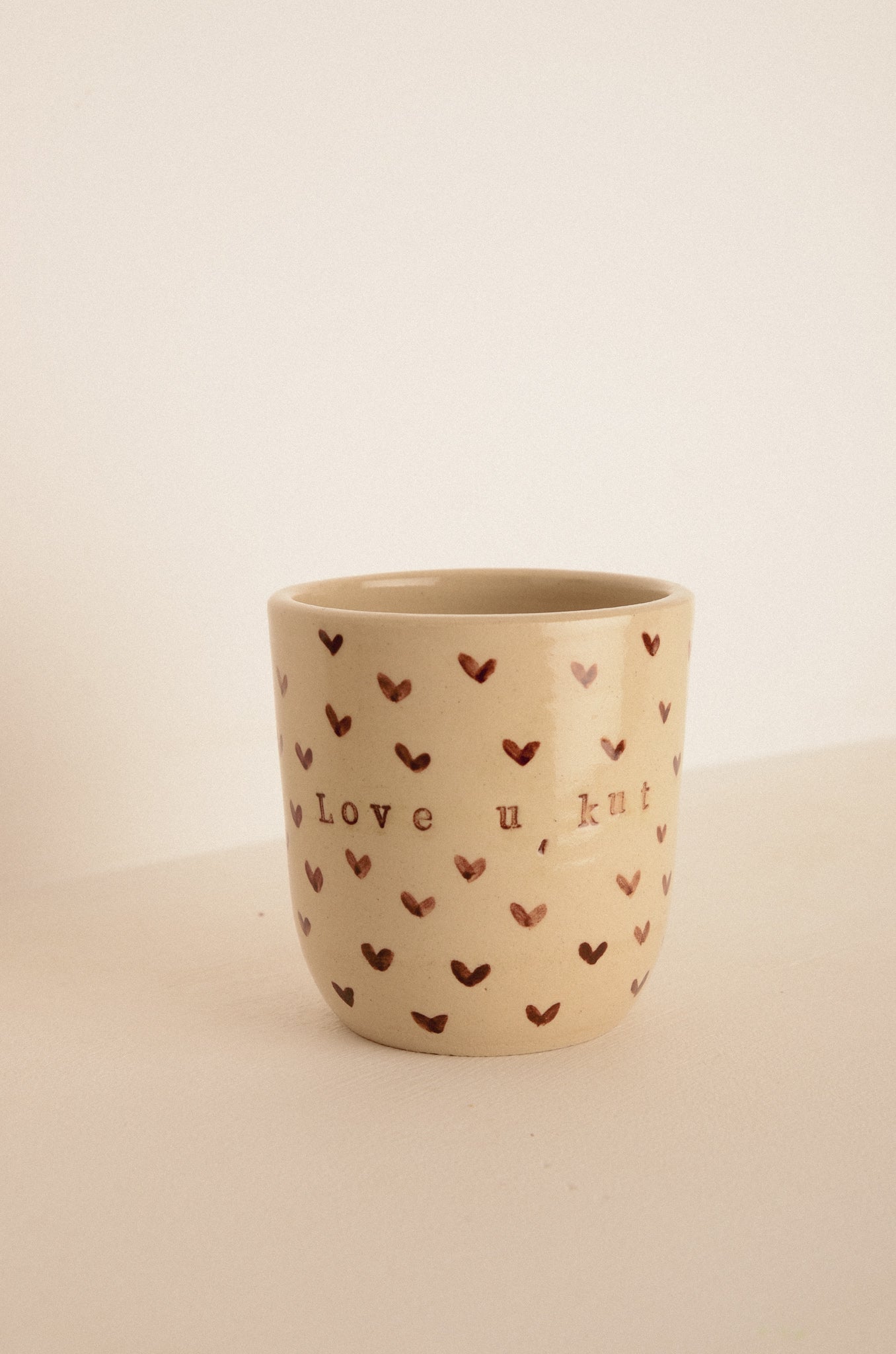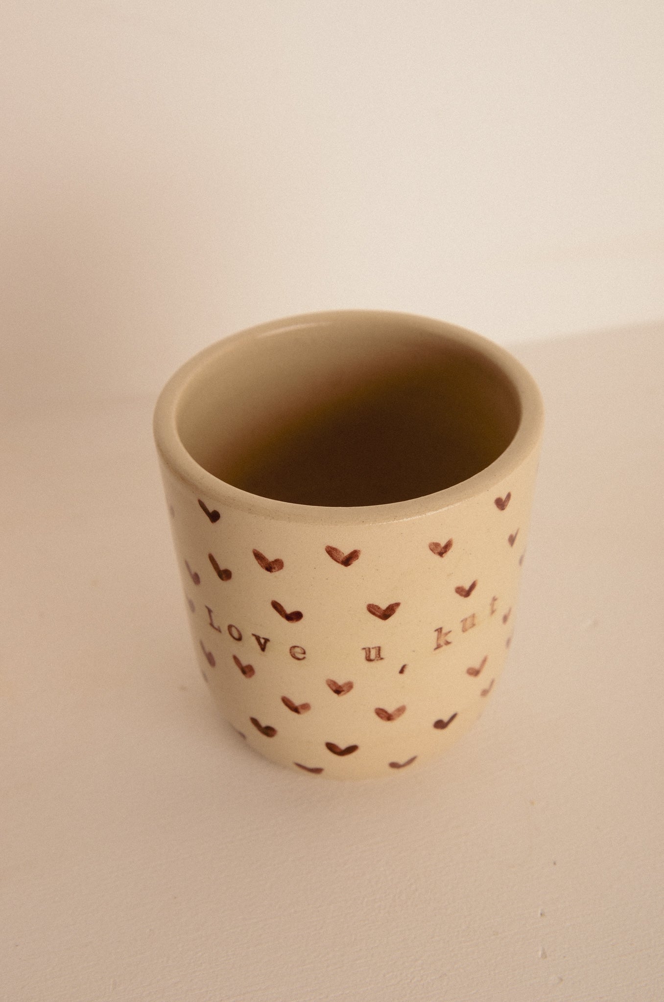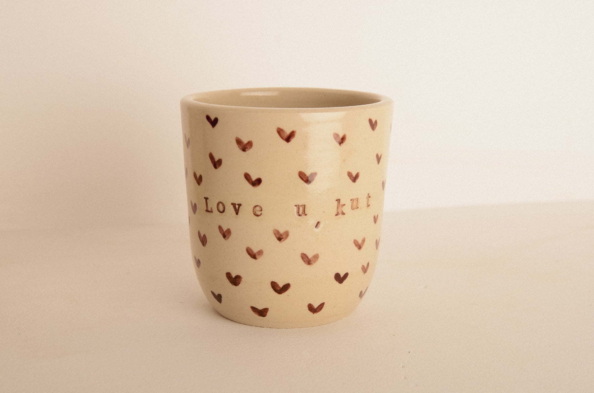 This cup is handmade on the potters wheel. With stamps is written: "Love you kut" brown text and brown decorative hearts, glazed with a transparent shiny glaze.