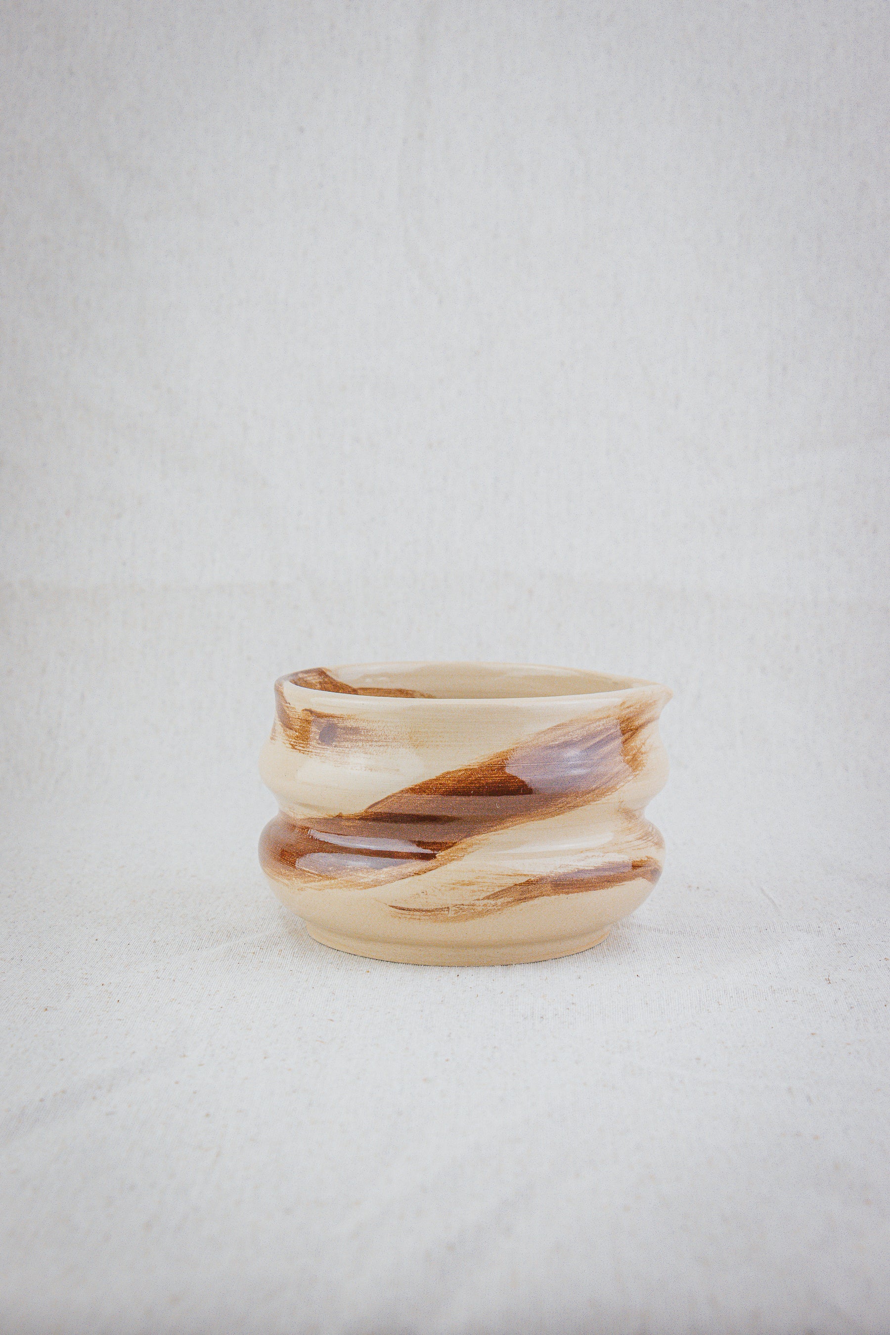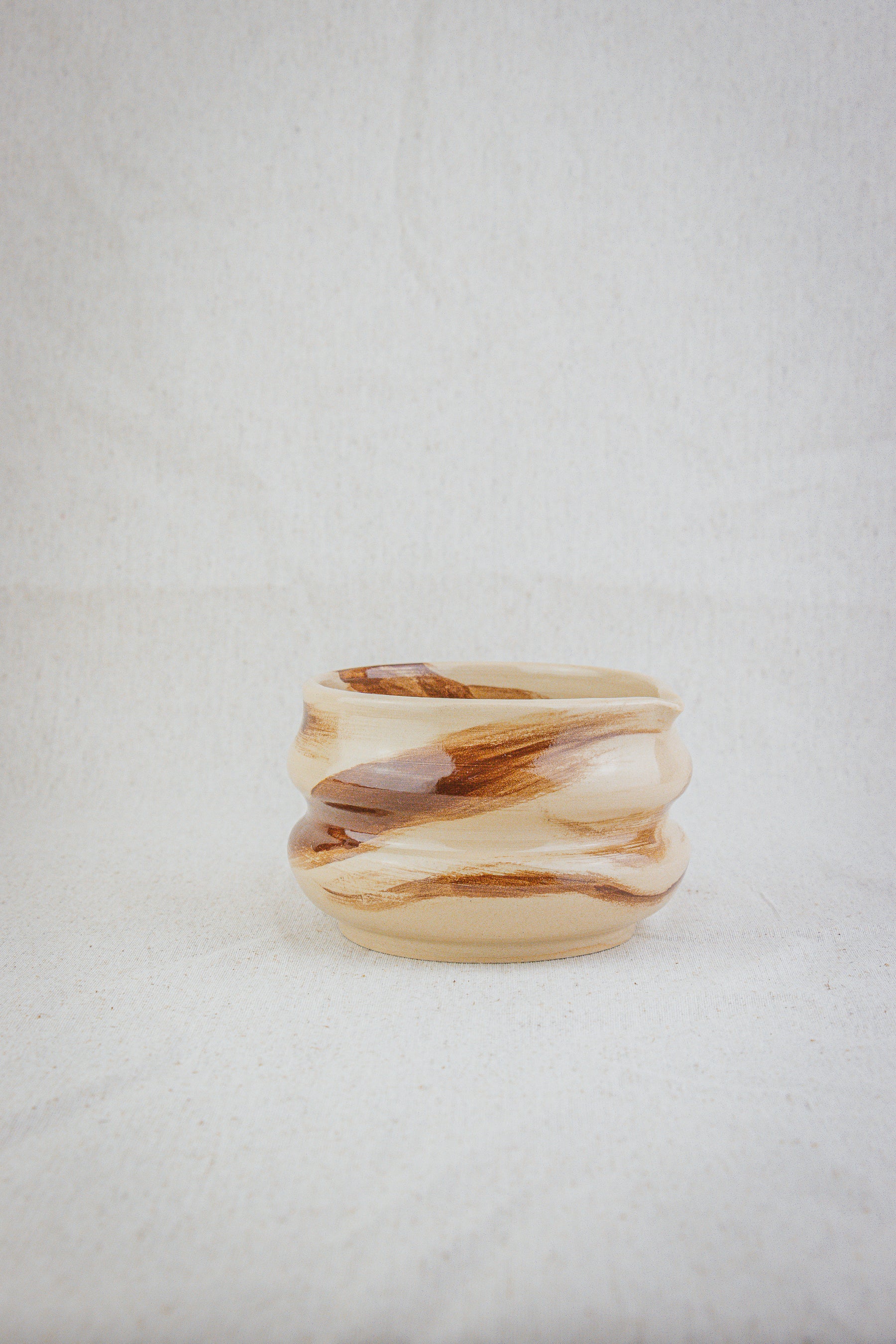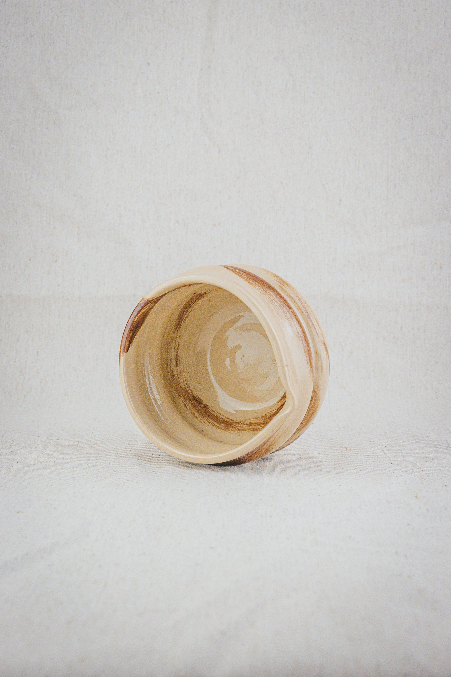 This ceramic matcha bowl is handmade on the potters wheel and glazed with a transparent glaze, showing the natural colour of the clay and has brown brushstrokes on the outside and on the inside.