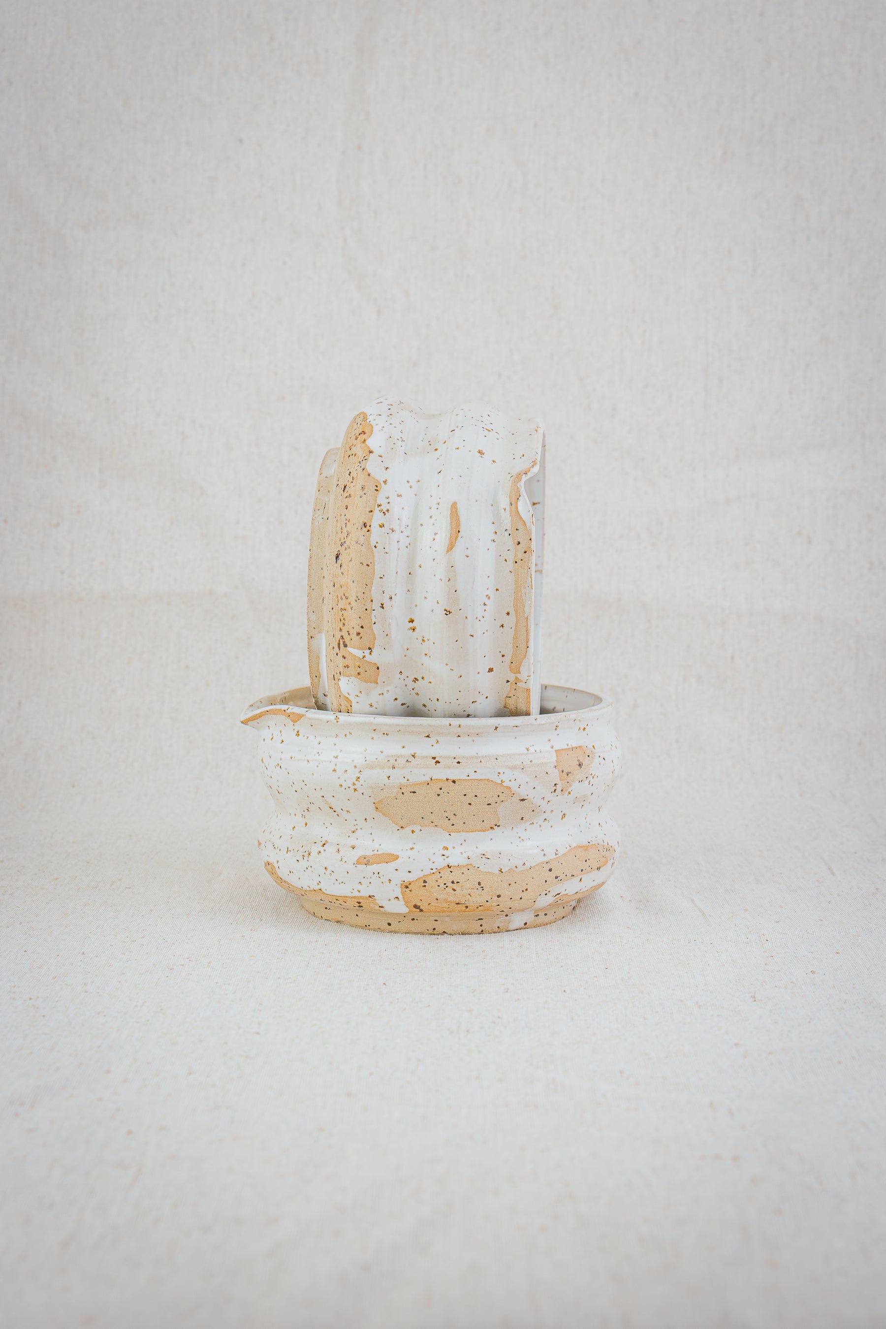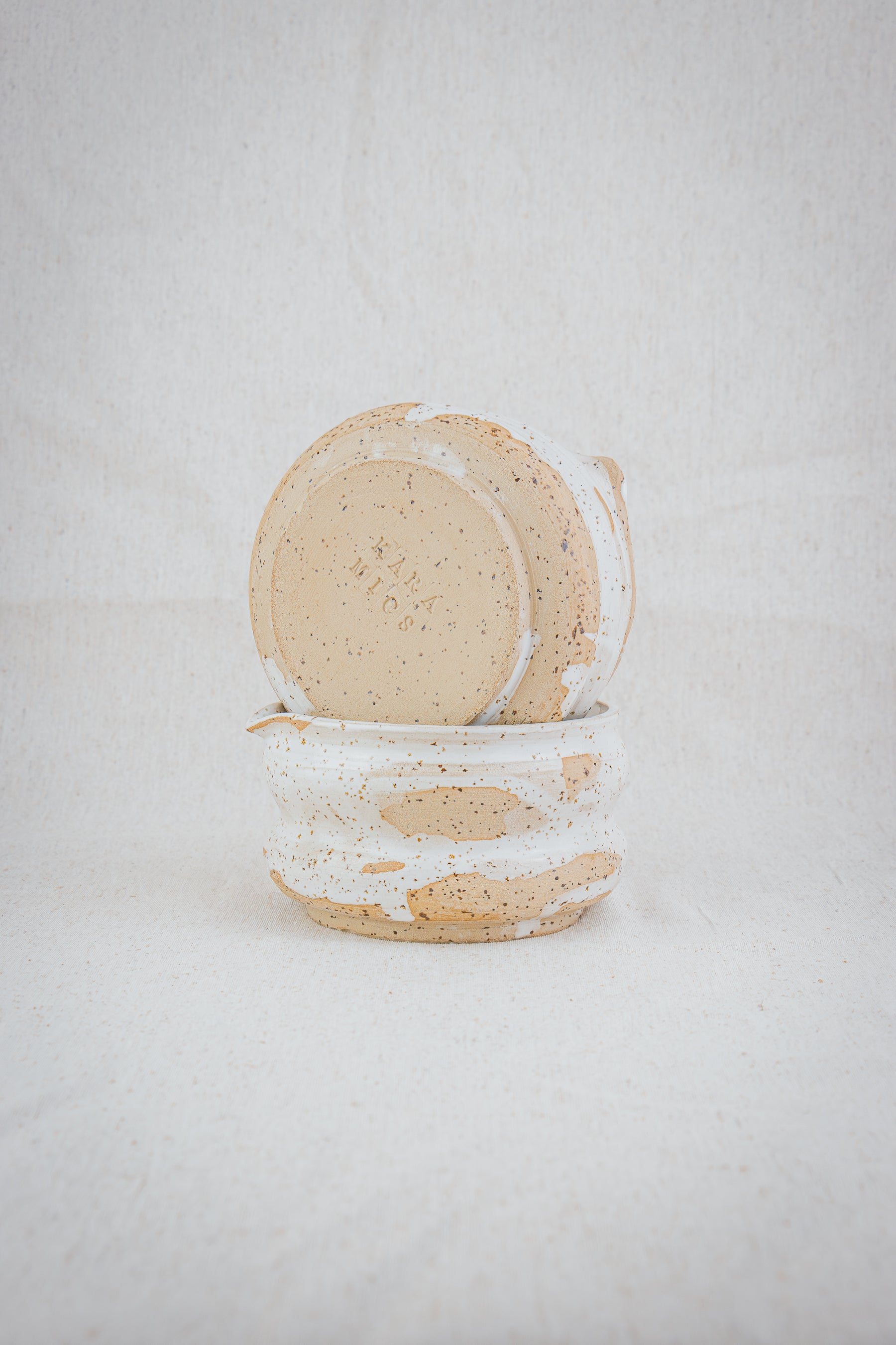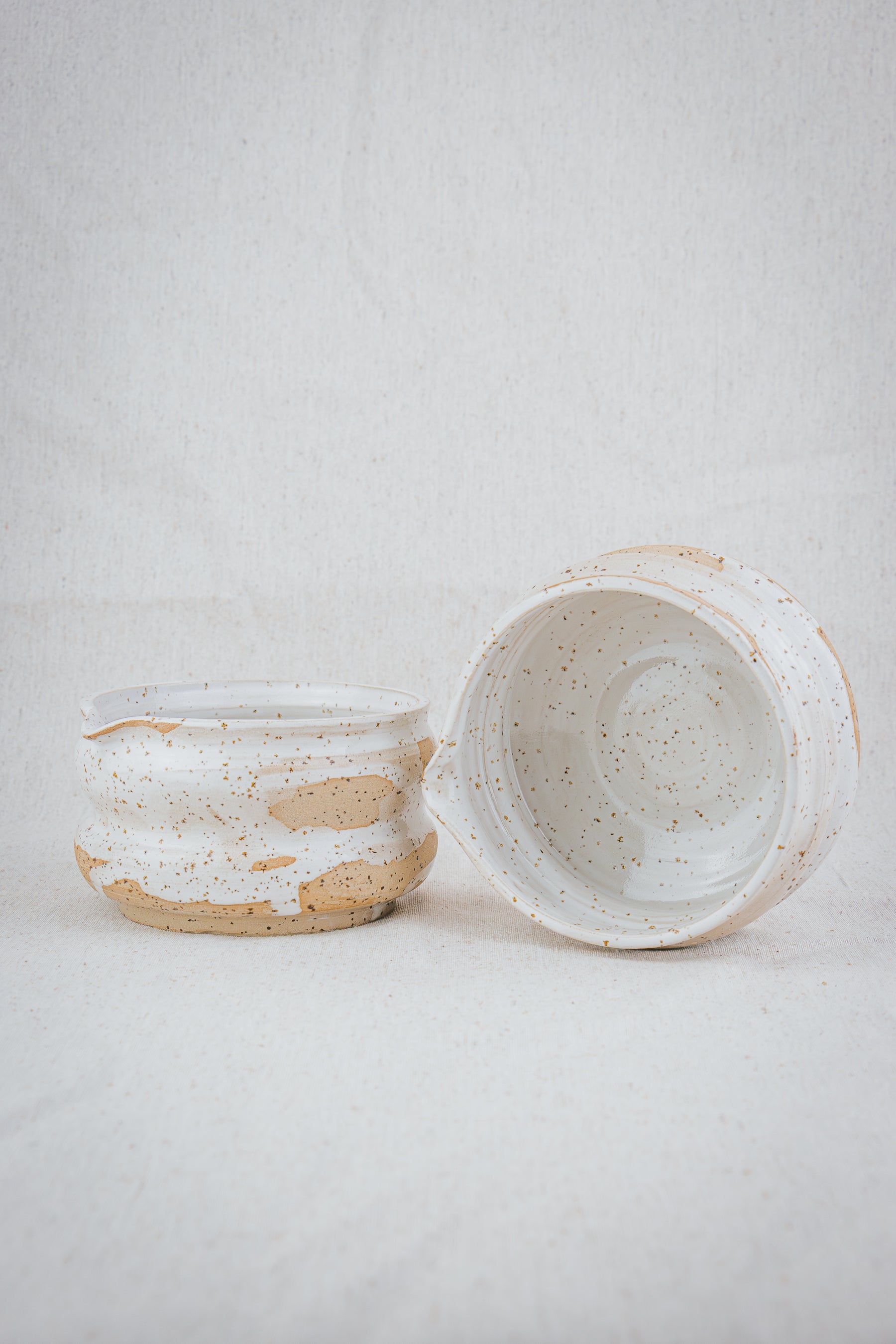 This matcha bowl is handmade on the potters wheel with a speckled clay and glazed with a white glaze, poured on the outside to create a playful effect, also showing the beauty of the raw clay.