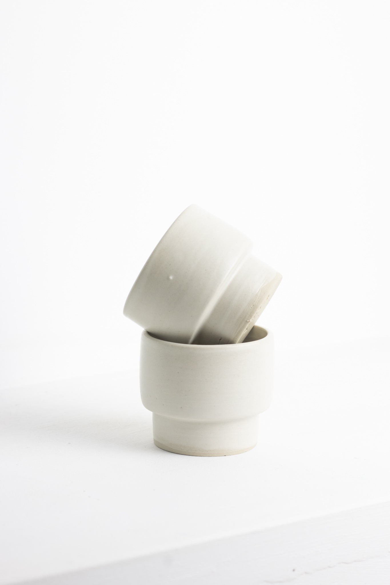 This stackable cup is handmade on the pottery wheel and glazed with a mat white glaze. Perfect way to store your cups, stacked up in each other. This cup is perfect for a double espresso.