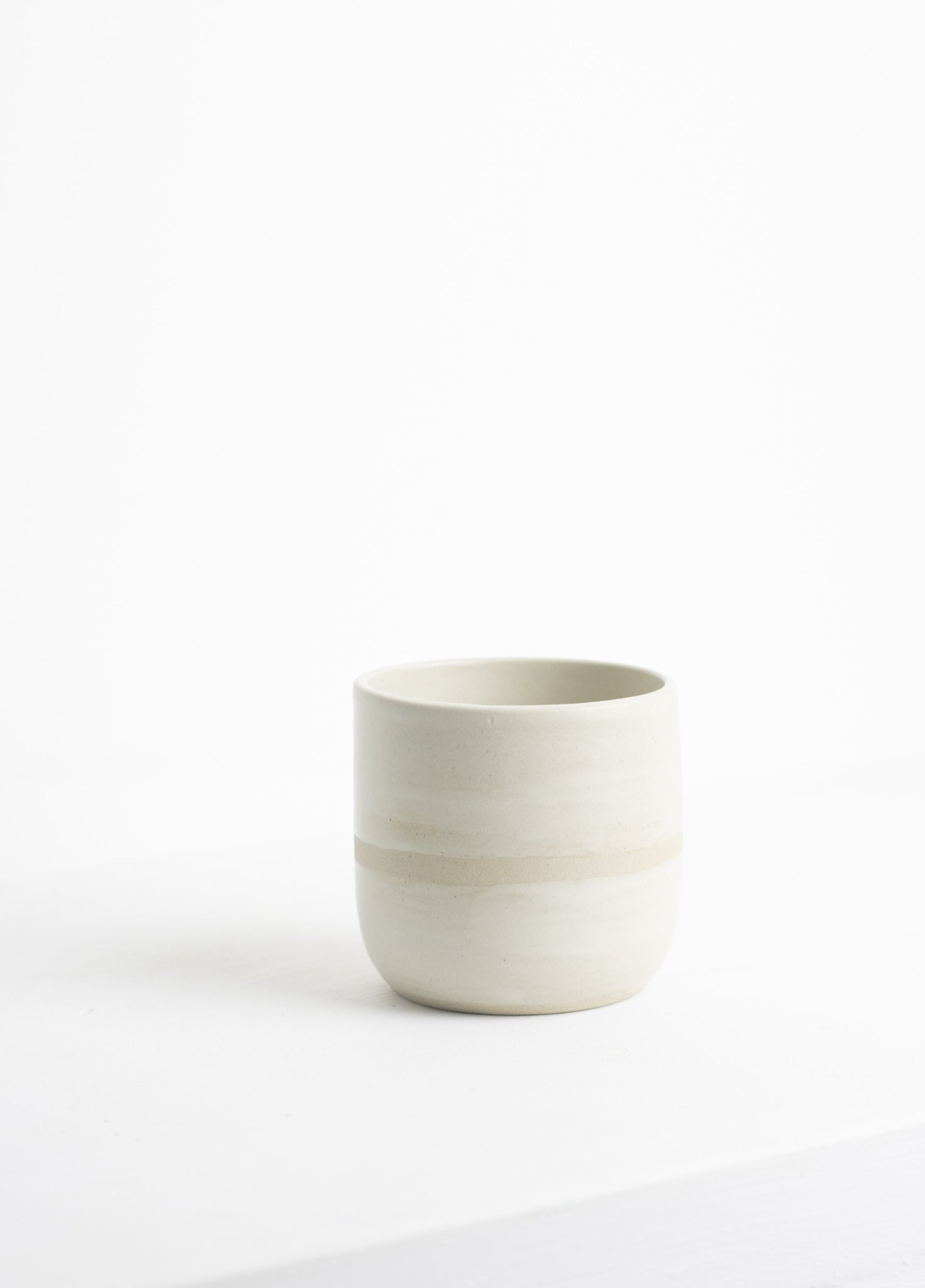 This cup is handmade on the pottery wheel and glazed with a mat white glaze. The mug has a horizontal stripe on the outside leaving raw clay open, creating a minimalistic design.