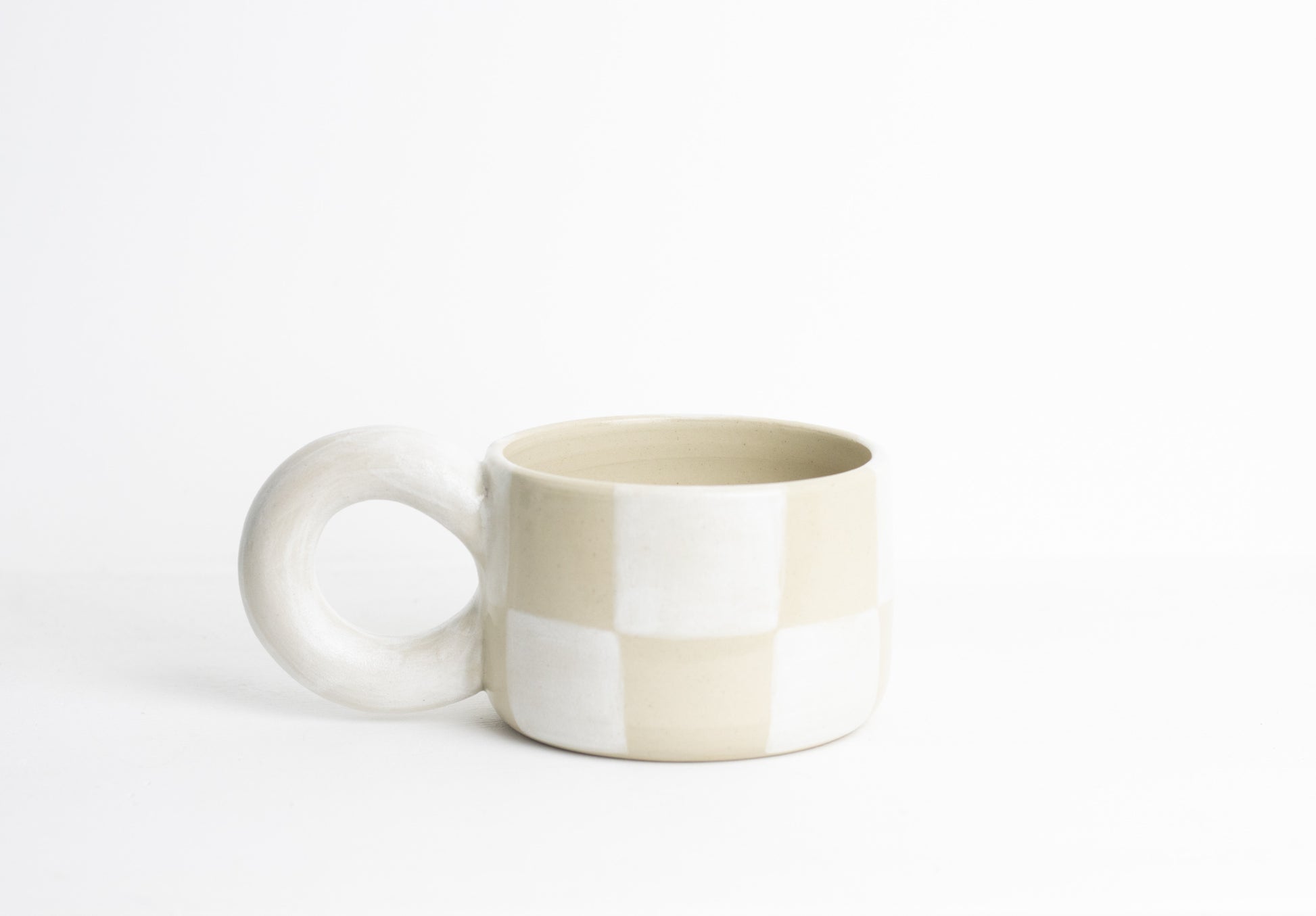 This mug is handmade on the pottery wheel and glazed with white checker design. The mug has a more rough/textured feel on the white parts.